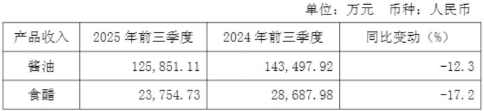 按业务来看,在报告期内,千禾味业两大核心产品收入均呈现下滑态势。作为业绩支柱的酱油产品营收同比下降12.3%至12.59亿元;食醋产品的营收降幅更为显著,同比下降17.2%,降至2.38亿元。